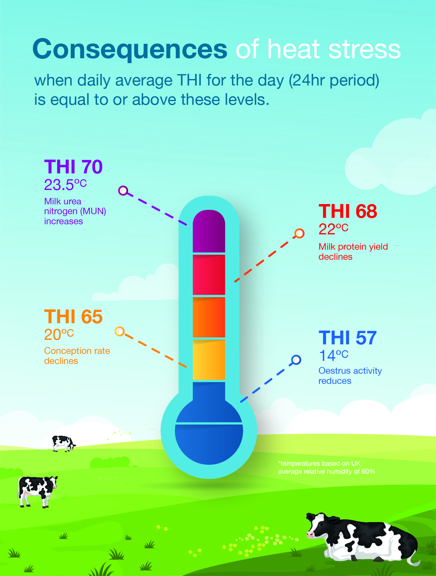 The consequences of heat stress are typically non-visible effects and only observed over a period of days, or weeks.  These occur when the daily 24-hour average THI is equal to, or above the thresholds shown and begin at much lower temperatures – fertility traits (oestrus activity) are impacted once daily 24-hour average temperatures exceed as little as 14°C (THI 57) and conception rates from 20°C (THI 65 – both readings with a relative humidity of 60%).