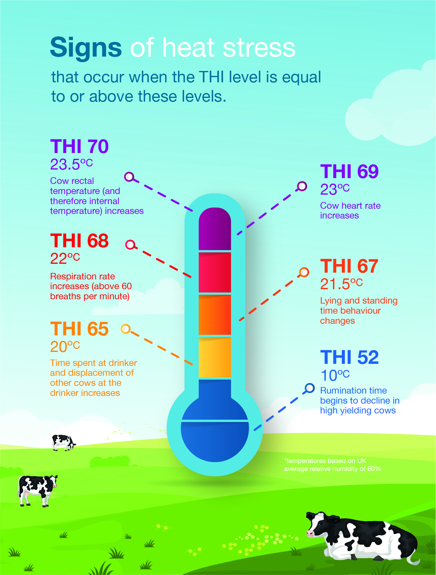 Humans do not really feel the impact of heat until temperatures reach 31°C, yet cows are physically uncomfortable and demonstrate signs of heat stress such as behavioural changes from as little as 20°C (at 60% relative humidity). Signs of heat stress can occur if the THI crosses any of the thresholds shown even for just 1-2 hours.